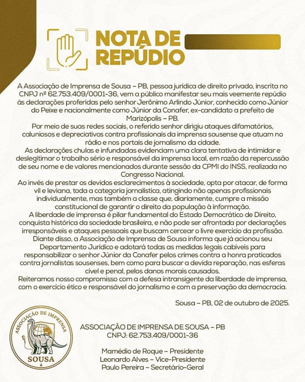 A Associação de Imprensa de Sousa (AIS) divulgou, nesta quinta-feira (2), uma Nota de Repúdio contra declarações feitas nas redes sociais por Jerônimo Arlindo Júnior, conhecido como Júnior do Peixe, ex-candidato a prefeito do município de Marizópolis.